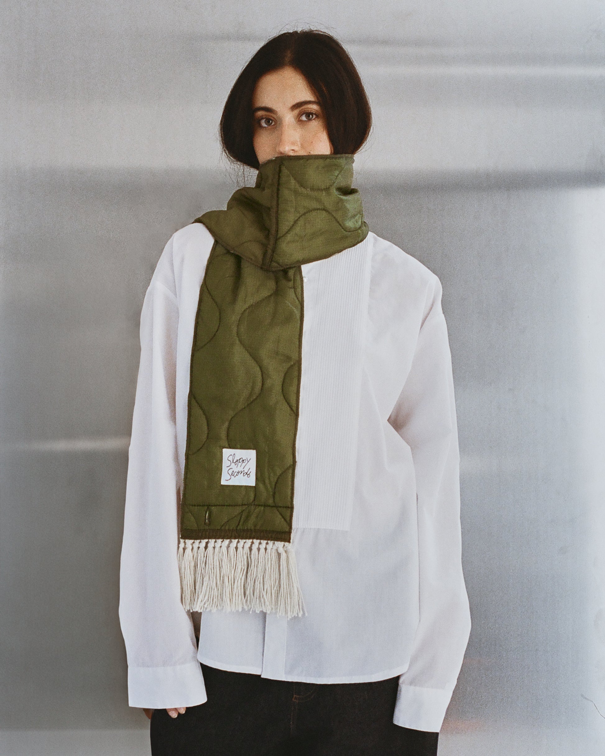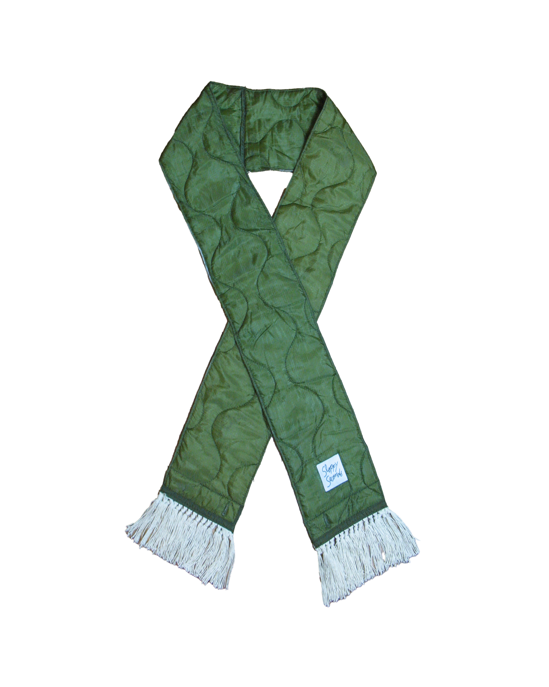 Made from vintage military liner pants, these scarves are the ultimate winter staple. They feature cotton fringe along the two ends, available in both green and cream .
