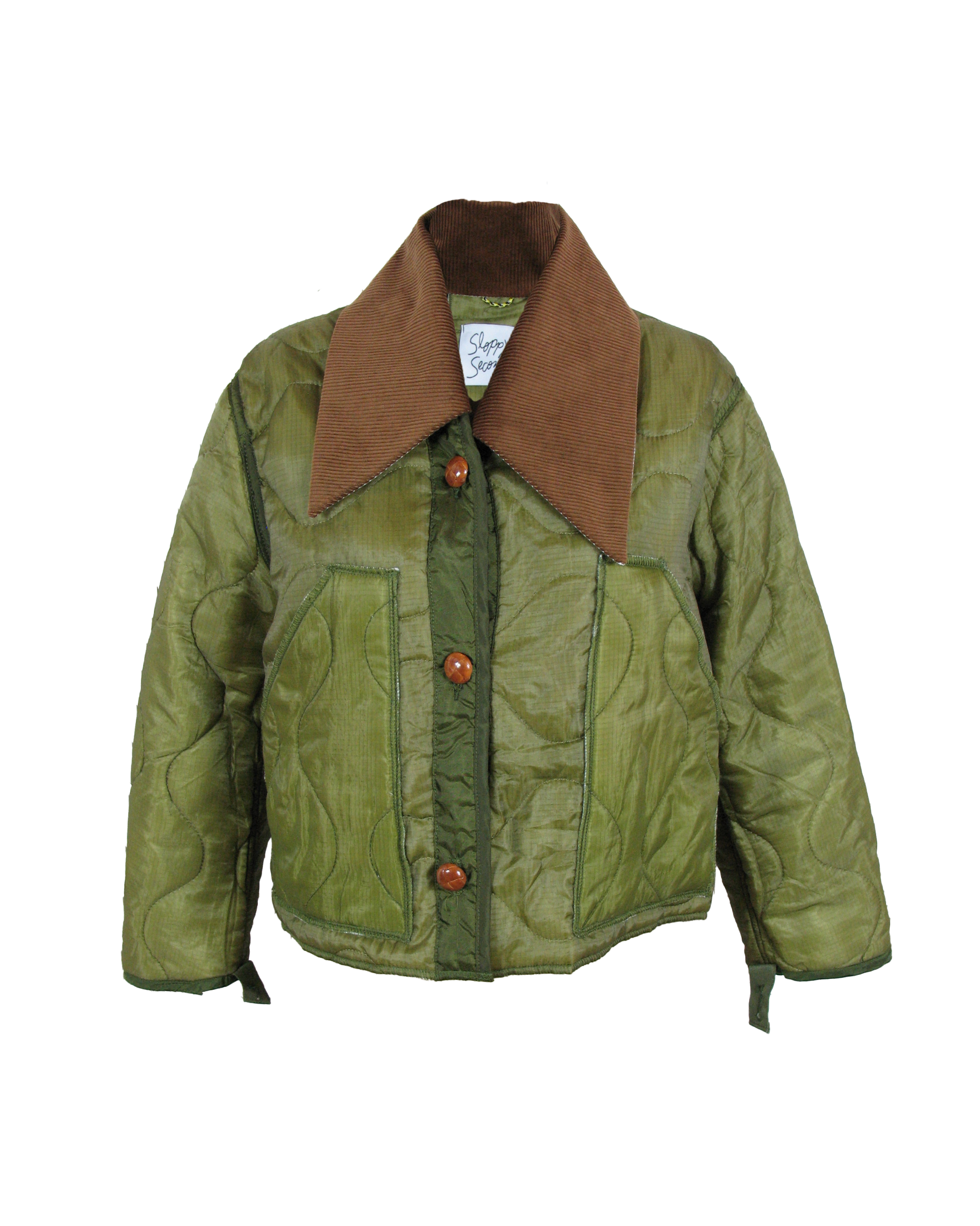 This slightly cropped liner remains in its original green color and features a tan removable corduroy collar lined with deadstock fabric, leather buttons, and cargo pockets.
