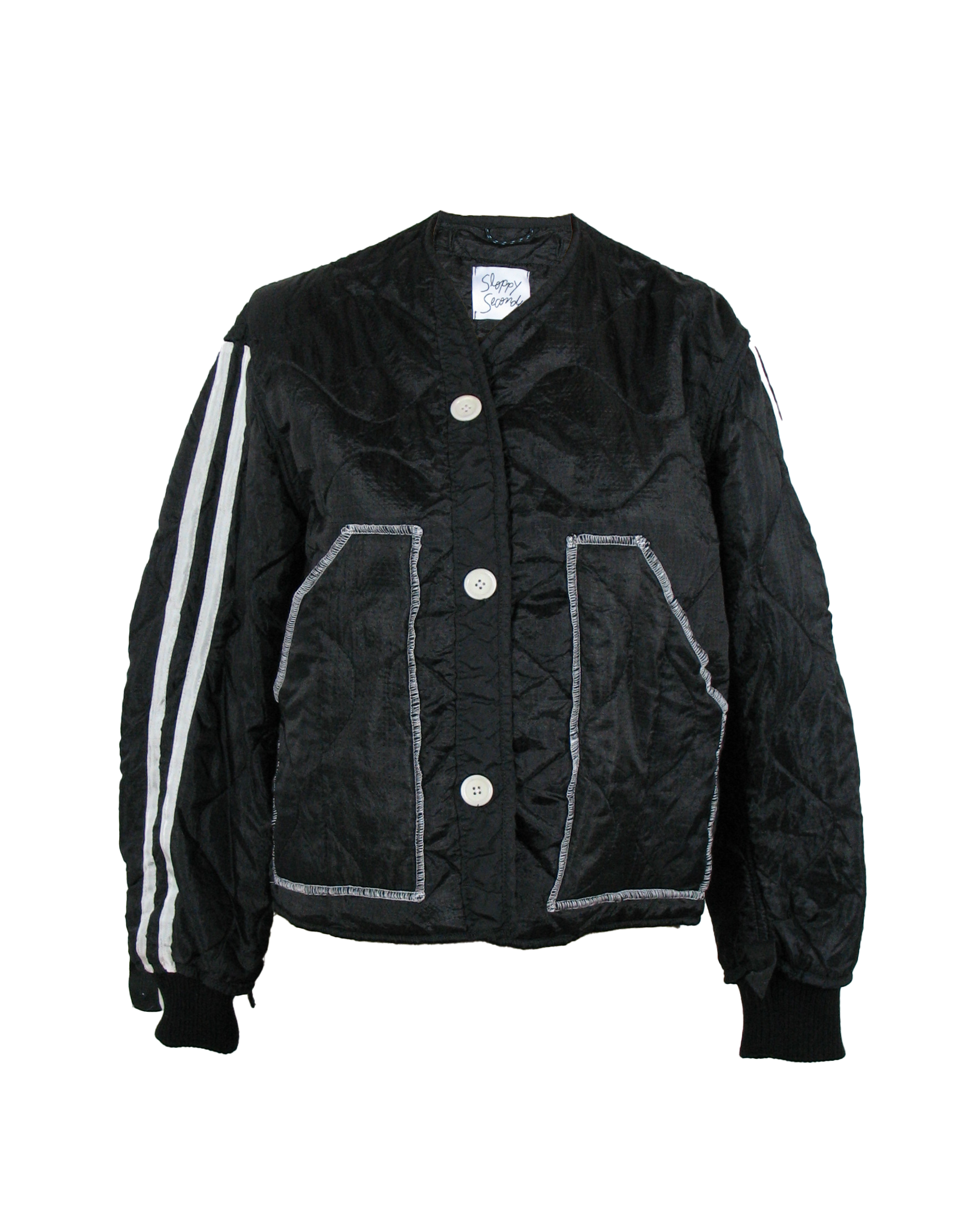This slightly cropped, sporty liner has been dyed black and features white button closures, white track stripes down the sleeves, and cargo shaped pockets.