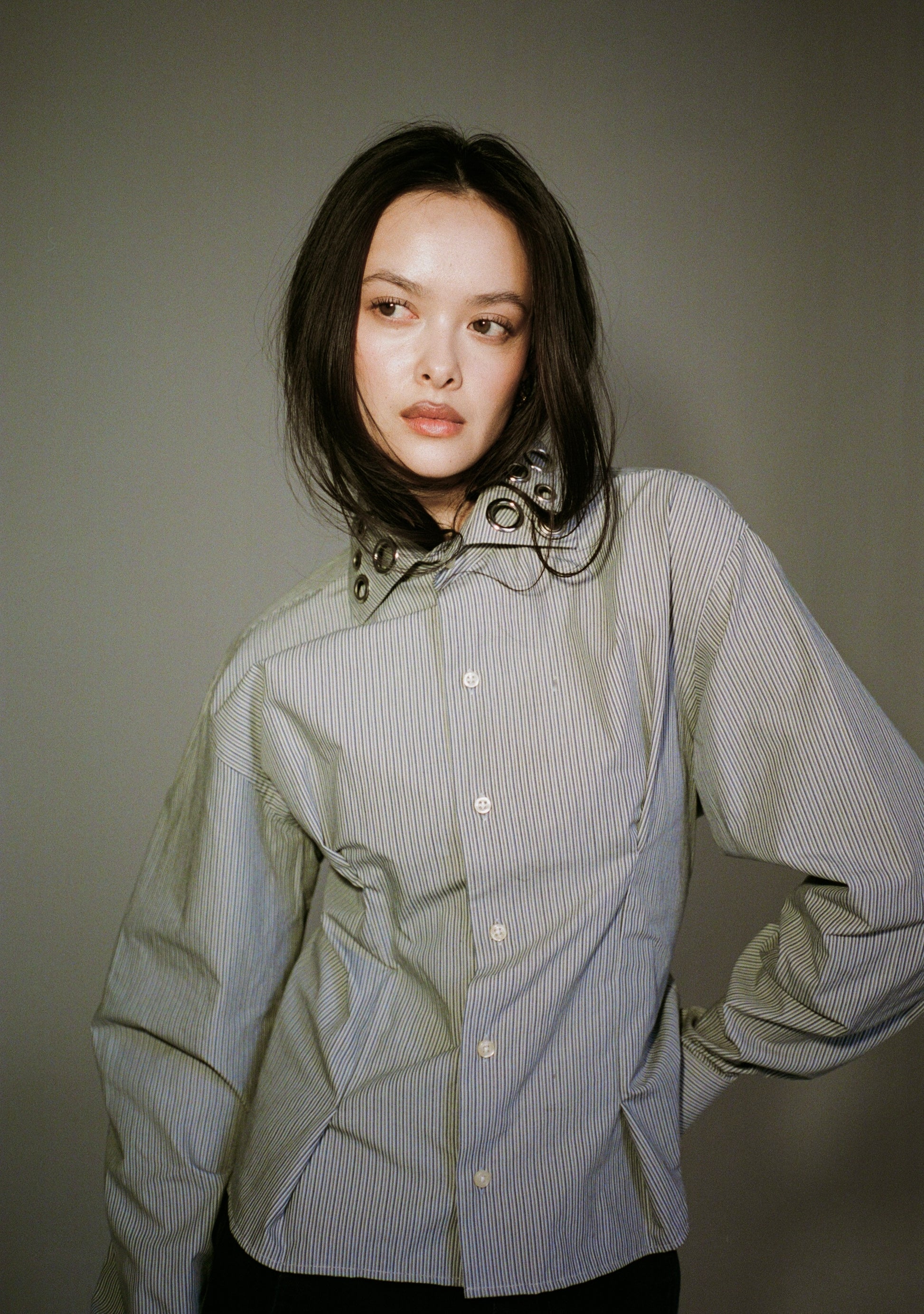 The Mike Top is a reworked men’s dress shirt with a statement grommet collar. It has two darts on each side to create a slightly more feminine cut while remaining somewhat boxier than our other styles.