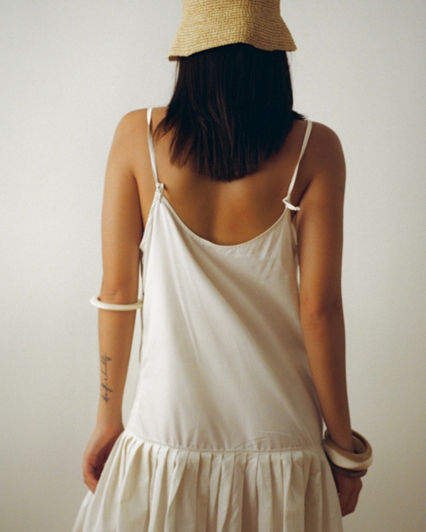 The William Dress is made from a high quality cotton deadstock fabric and features a drop waist, a softly pleated skirt, and adjustable straps. It strikes the perfect balance between feminine and sporty.